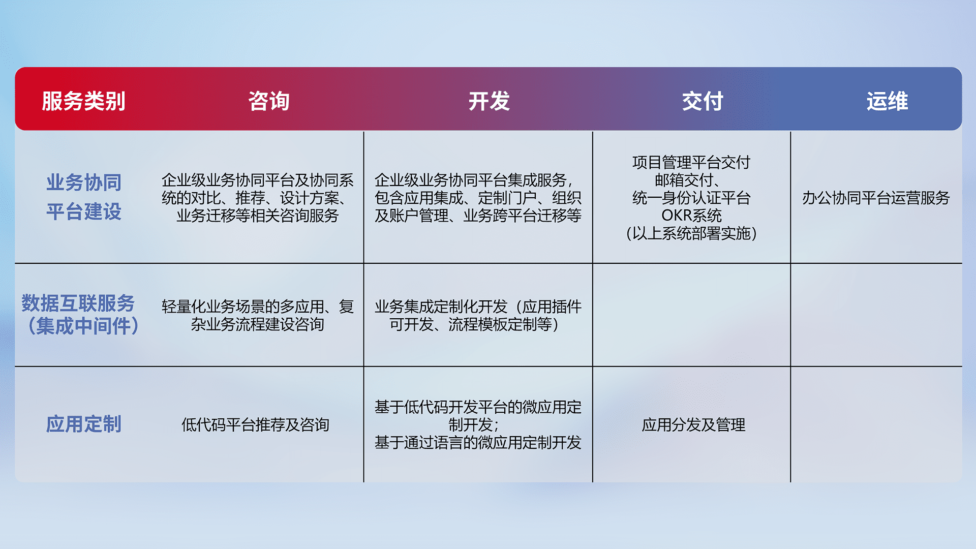 针对钉钉、、、、企微、、、、IDaas等平台级产品提供产品的规划、、方案、、交付、、、定制化开发等服务,,实现如统一协同办公、、智能客户服务、、、、混合会议管理、、、智能数据查询、、等业务场景,,实现数字化转型。。。