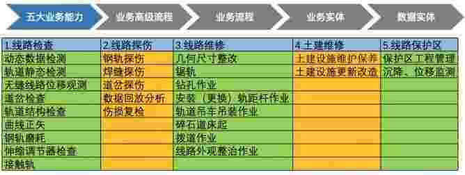 在轨道运维业务中,,,,,,,,我们形成了完整的从业务能力(业务域)-业务流程-业务实体-数据模型的分析梳理过程。。。。。。。。轨道运维业务能力如下图所示::::::