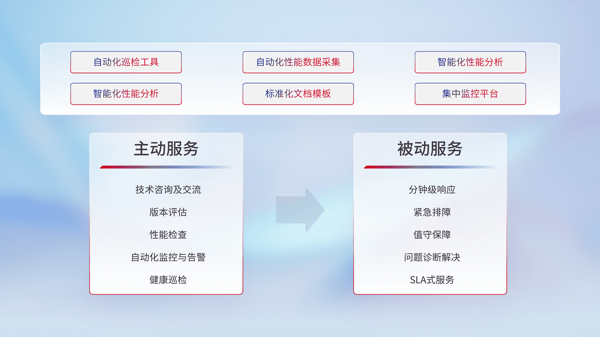 智能化工具和标准化文档,,保障服务质量,,提供主动服务(包含技术咨询、、版本评估、、、性能检查、、自动化监控与告警、、、健康巡检)和被动服务包含(分钟级响应、、、紧急排障、、、、值守保障、、、、问题诊断解决、、、SLA服务)。。。。